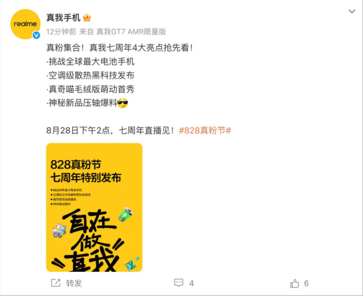 挑战最大电池手机、发布空调级散热黑科技 真我“828粉丝节”官宣